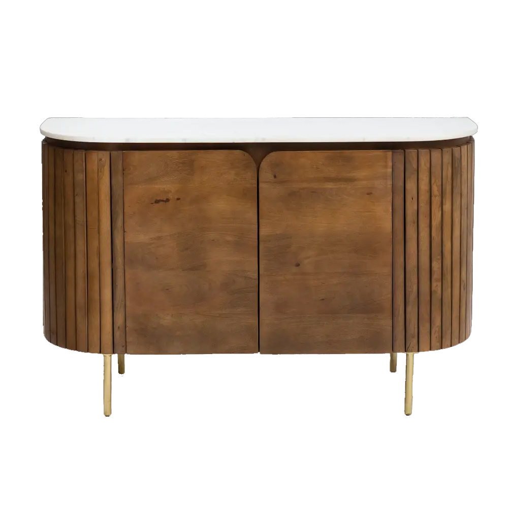 Apportez une touche de sophistication à votre intérieur avec ce magnifique cabinet en bois de manguier avec dessus en marbre. Le contraste entre la chaleur naturelle du bois et la noblesse du marbre crée un équilibre parfait entre style contemporain et matériaux intemporels. Le plateau en marbre ajoute une note élégante et raffinée, idéale pour mettre en valeur objets décoratifs, lampes ou accessoires. La structure en bois de manguier, avec ses nuances riches et ses variations naturelles de grain, apporte caractère et authenticité à l’ensemble. Son design distinctif se démarque par ses détails de panneaux verticaux texturés, qui ajoutent relief et modernité au meuble. Doté de deux portes, ce cabinet offre un espace de rangement pratique pour organiser vaisselle, accessoires ou objets du quotidien. Reposant sur de fines pattes métalliques, ce meuble conserve une allure légère et contemporaine qui s’intègre parfaitement dans un salon, une salle à manger ou une entrée.Read More