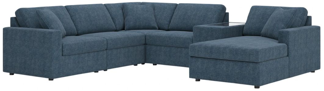 Comprend 6 éléments modulaires : fauteuil d'angle avec accoudoir gauche, 2 fauteuils sans accoudoirs, console avec rangement, coin et chaise longue d'angle avec accoudoir droit.
