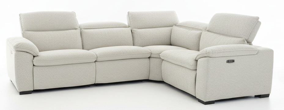 Sectionnel 4 morceaux avec deux sièges inclinables électriques et têtes électriques en tissu et assises de plume. Le siège sans bras est interchangeable donc le sectionnel peut être plus long d'un côté comme de l'autre, nous pouvons également ajouter des assises et finalement, il est aussi disponible en Sofa condo, causeuse et fauteuil, en 100% cuir, cuir combiné et tissu.Read More