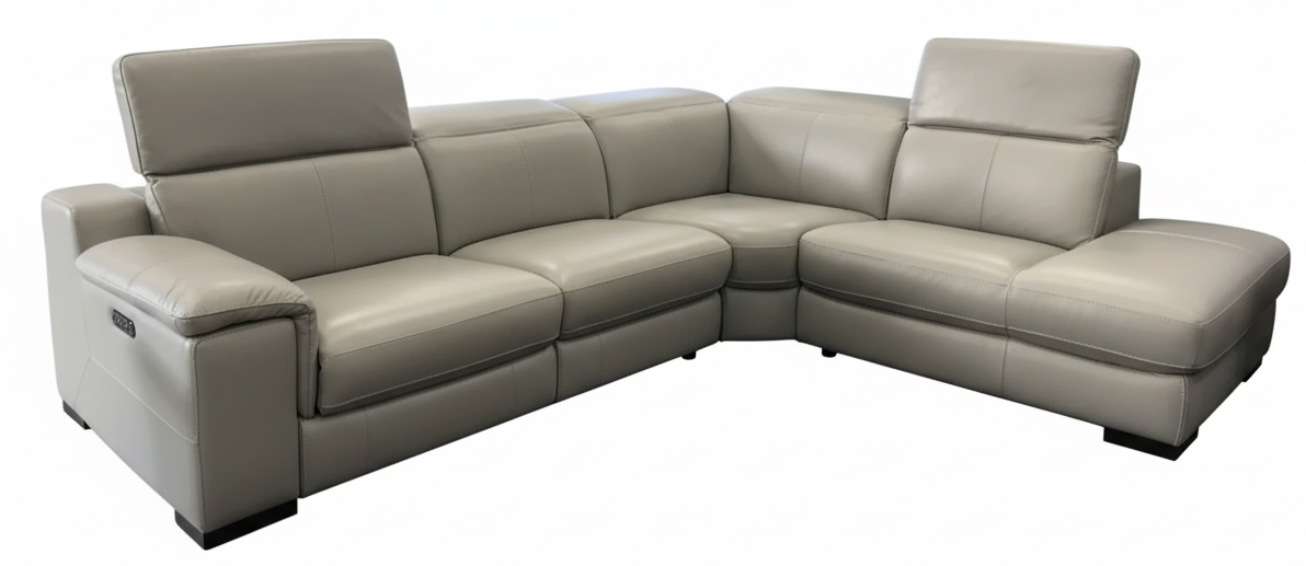 Sectionnel avec deux sièges inclinables électriques et têtes électriques en cuir combo. Mobilier aussi disponible de l'autre côté et aussi en Sofa condo, causeuse et fauteuil, en 100% cuir, cuir combiné et tissu.Read More